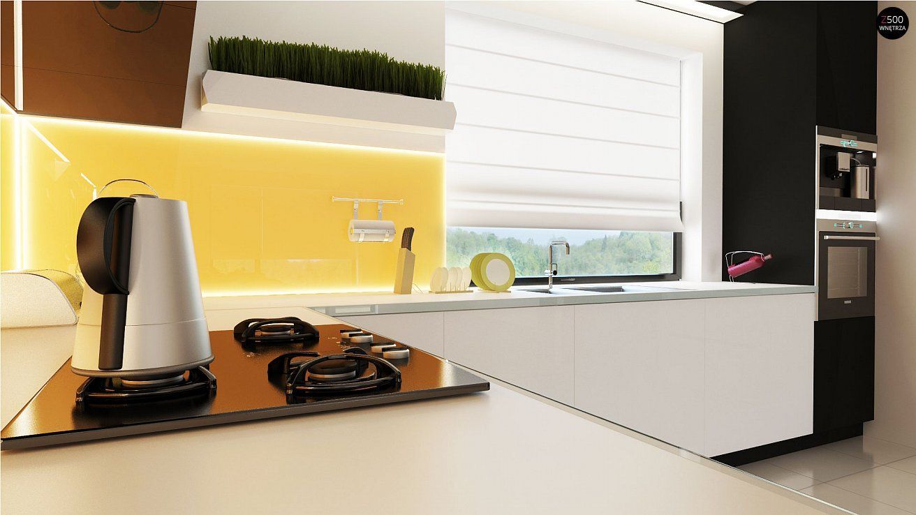 Основное отличие этого коттеджа – это остекленная терраса, которая расположена углом. Она примыкает к заднему и торцевому фасаду дома. Часть террасы закрыта с двух сторон стенами дома и гаража. За счет этого элемента повышается функциональность дома. При этом здание получилось достаточно привлекательным и своеобразным.