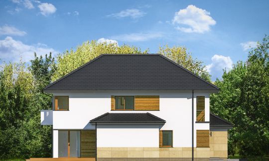 Этот двухэтажный коттедж отличается современным стильным дизайном и рациональной организацией внутреннего пространства. Его фасады имеют нелинейную архитектуру и выглядят очень свежо и светло, благодаря отделке белой штукатуркой в сочетании с декоративными стеновыми панелями и элементами, имитирующими светлое дерево.
