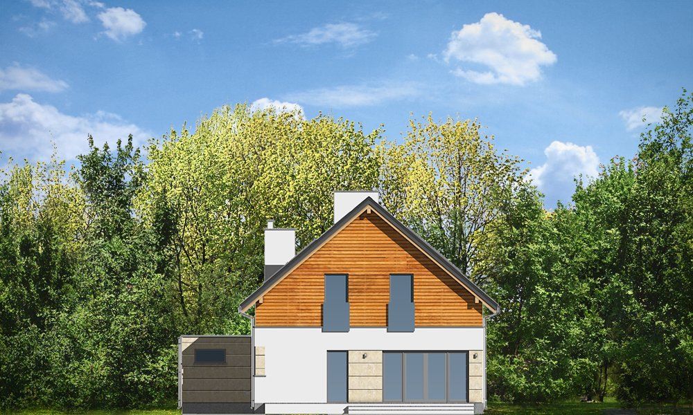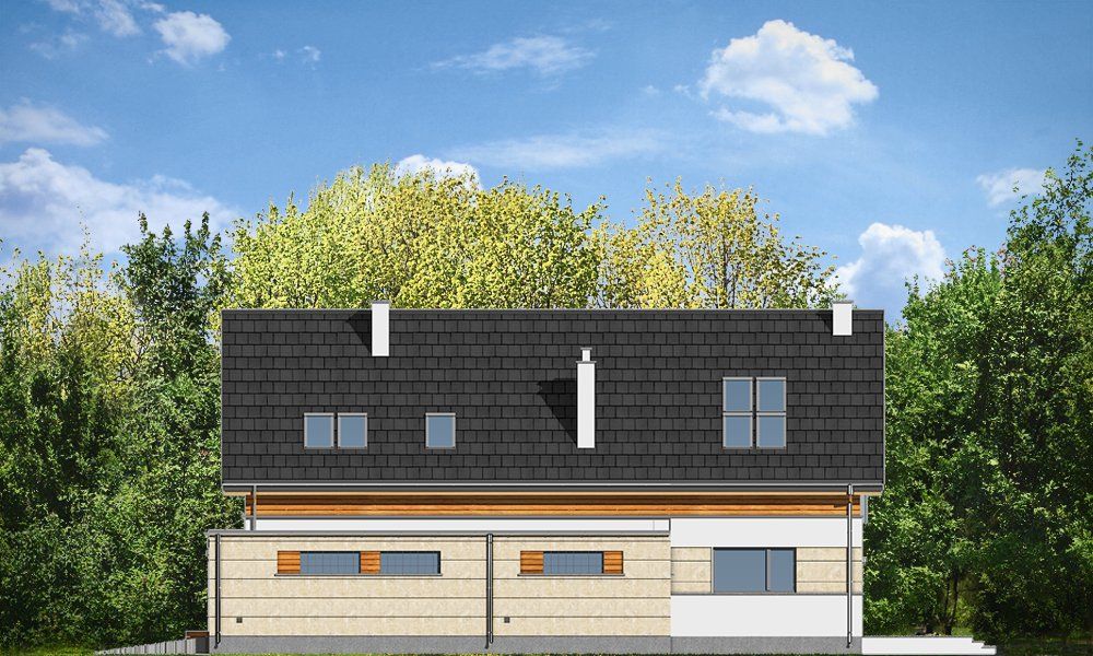 Это проект одноэтажного дома с мансардой для большой семьи. Сама по себе площадь помещения небольшая, что компенсируется большим жилым чердаком. Спроектирован дом в два яруса. Первый уровень – это прямоугольный гараж с двумя заездами под несколько автомобилей. А второй ярус частично нависает над гаражом. Двускатная черепичная крыша частично накрывает гараж, что придает внешнему виду постройки индивидуальности.