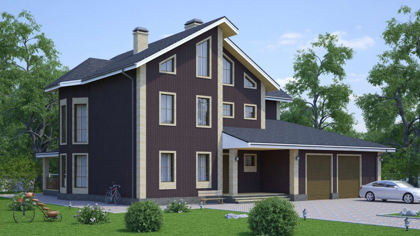 Проект современной двухэтажной резиденции демонстрирует современное видение классического стиля: симметрия форм, строгость и четкость линий, колонны. В итоге архитектура дома удивляет своей элегантностью, хотя и не лишена доли консерватизма. Оригинальное сочетание цвета шоколада и сливок в отделке превращают коттедж в аристократическое жилье, придавая зданию нетривиальный внешний вид.